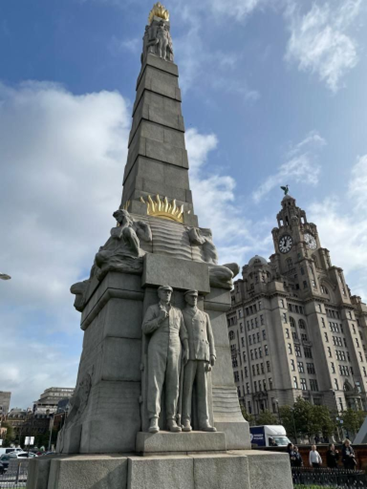 The Titanic Memorial monument and the Royal Liver Building in Liverpool.